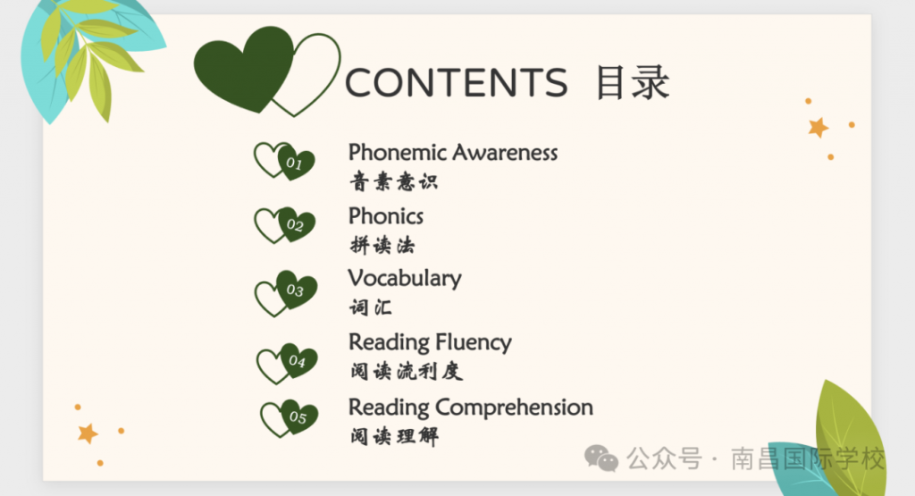 最后一场讲座“阅读的五项核心技能” 由Rosalyn老师主讲,聚焦音素意识、自然拼读、词汇、阅读流畅度及阅读理解。家长们了解到这些技能如何共同作用以培养优秀的阅读者,以及如何在家庭环境中提供有效支持。