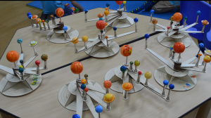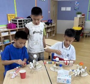 小学班的教室则化身为 “行星研究所”。“未来宇航员”们的星际远征,始于对头顶星空的无限好奇:“为什么月亮会变脸?”“火星上真的能找到水吗?”“如果地球‘生病’了,人类能去哪里?”带着这些宏大的问题,“探索家”们首先动手构建宇宙的模型。他们用不同大小的球体,亲手制作“太阳系八大行星模型”,在转动中直观演示昼夜更替、四季轮回和月亮的阴晴圆缺。