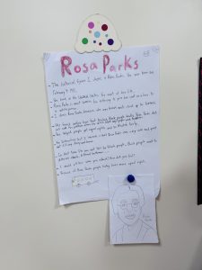 Students presented their findings to the class, sparking thoughtful discussions about who these women were and why their contributions mattered. As a group, the class chose to explore Rosa Parks in greater depth. Through short videos and interview clips, students learned more about her life and legacy, shared their ideas, and reflected on why Rosa Parks remains an inspirational figure and what her story taught them.