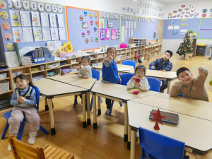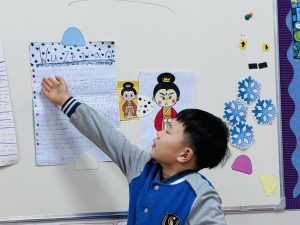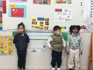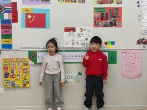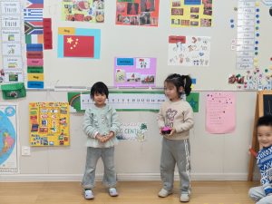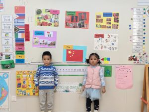 Students explored important elements of Chinese culture, including the national flag, anthem, language, food, traditional clothing, and celebrations. They learned that the Chinese flag has special colors and stars with meaning, and that the national anthem is a special song that people listen to respectfully. Through songs, role play, pictures, and discussions, children also practiced simple Chinese words used in everyday situations, such as greeting others and showing kindness.