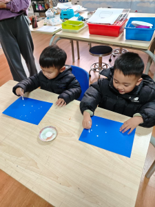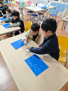 Our Butterfly class welcomed the new year by diving into a winter-themed, hands-on art inquiry! Aligned with the Reggio Emilia principle of the environment as “the third teacher,” we began by observing and naming winter’s special colors in English—sparkling whites, icy blues, and cozy greys.