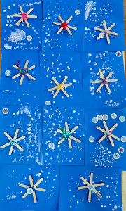 Students then practiced fine motor skills using Q-tips to paint falling snow, and wrapped their unique paper snowflakes in colorful yarn “scarves”—a joyful exercise in self-management and choice. Inspired by Brigitta Auškalnytė’s short film Snowflake (2021), they added a “snowflake friend” to their artwork, encouraging creative and critical thinking.