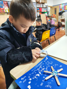 我们的Butterfly班以沉浸式的冬季主题动手艺术探究迎接了新的一年!根据瑞吉欧·艾梅丽亚(Reggio Emilia)的环境是“第三位老师”的原则,我们从观察和用英语命名冬季的特殊颜色开始——闪闪发光的白色、冰冷的蓝色和舒适的灰色。